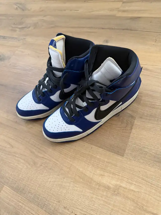 Nike Dunk High x AMBUSH sneakers in the blue, white, and black colorway. Bold design with extended Swoosh and premium detailing — a standout collab sneaker.