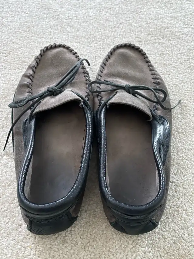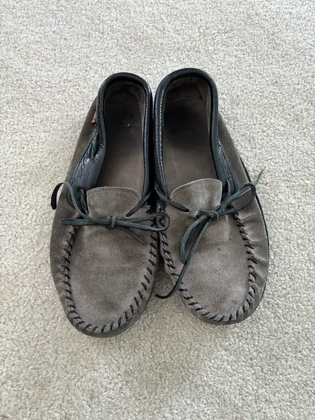 Laurentian Chief leather slippers men's size 10 in good condition. Lacing and seams all intact. Worn indoors. Originally size 10, slightly stretched so may fit bigger.