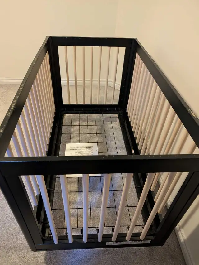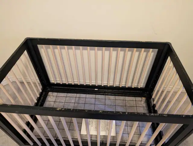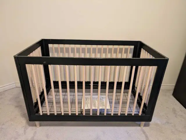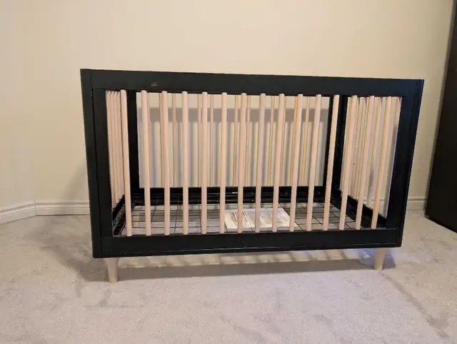 This is a gently used Babyletto Lolly crib with a sleek black and natural wood finish, perfect for a modern nursery. This crib has been well-maintained and is in good condition, ready for your little one's sweet dreams. It features a sturdy construction and a stylish design that will complement any room decor.