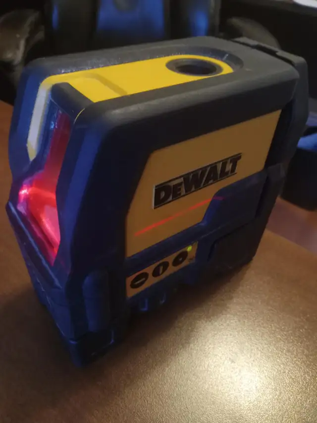 DEWALT DW0822 - Self-Leveling Cross Line Plumb Spot Laser Projects bright crossing horizontal and vertical lines 2 bright, self leveling beams provide accurate plumb point transfer Projects down beam with raised clearance provides dot visibility and alignment for wall track layout Integrated magnetic pivoting base with ¼" thread front and rear mounted magnets allow flush attachment to metal track and steel Full-time pulse mode allows use with detector maintains full brightness for visibility Locking pendulum to help prevent damage to internal components Durable design over-molded housing and IP54 water/debris resistance Excellent condition, don't need anymore, new $448 with tax, first $110 takes it, phone (431) 276-1653