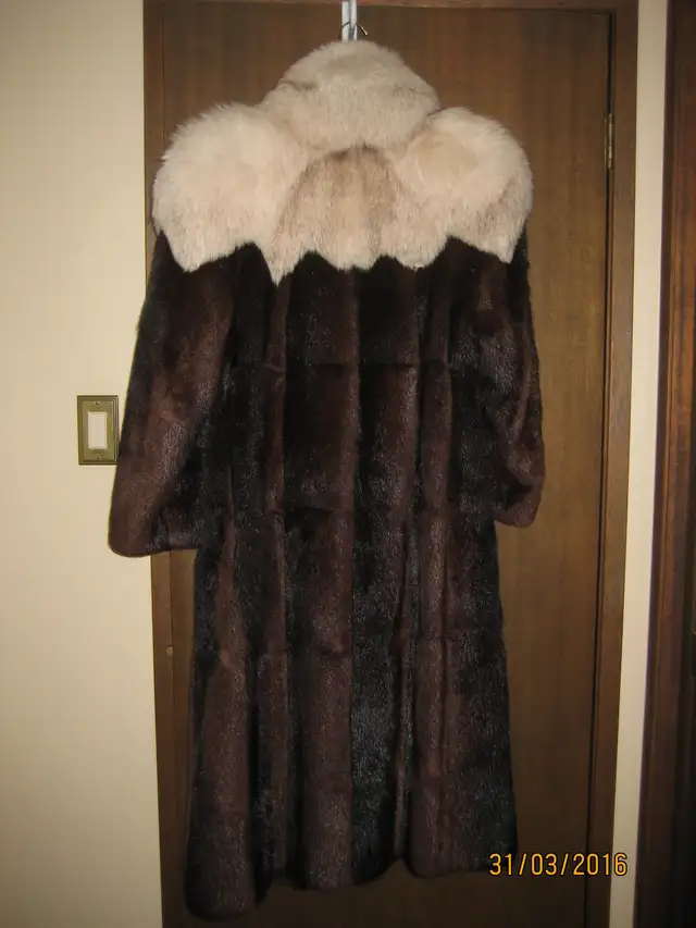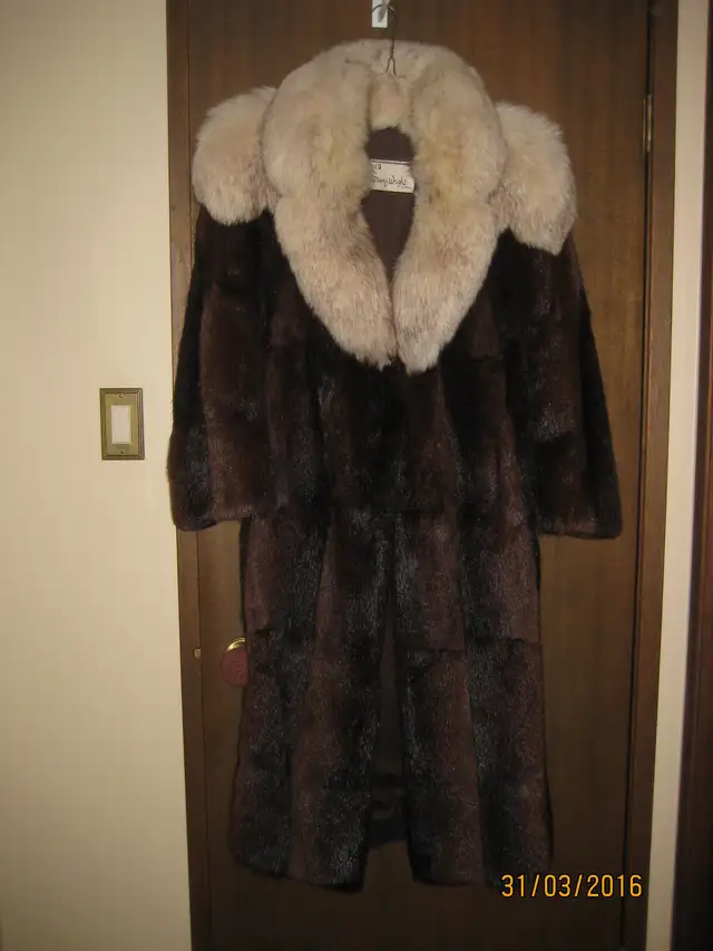 Steen & Wright Furriers Full Length Muskrat Fur Coat with Fox Collar. In Excellent condition. Size 12-14.