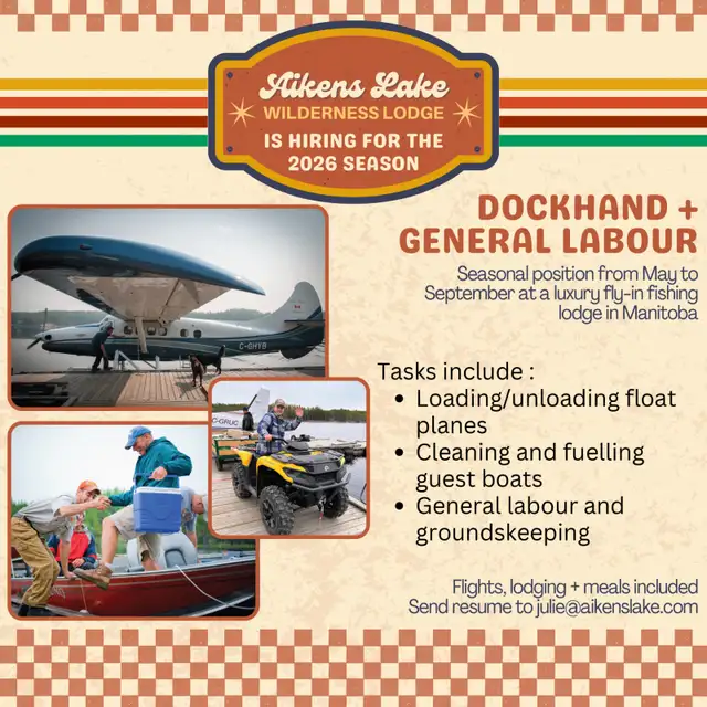 Aikens Lake Wilderness Lodge is accepting applications for the position of Dockhand as well as for the position of General Labourer for the upcoming summer season.