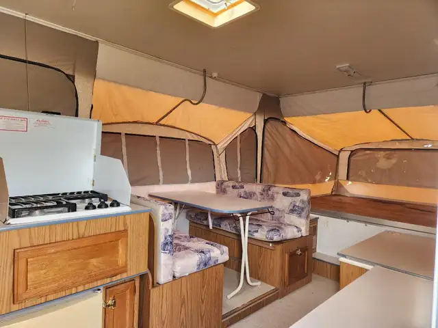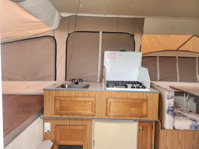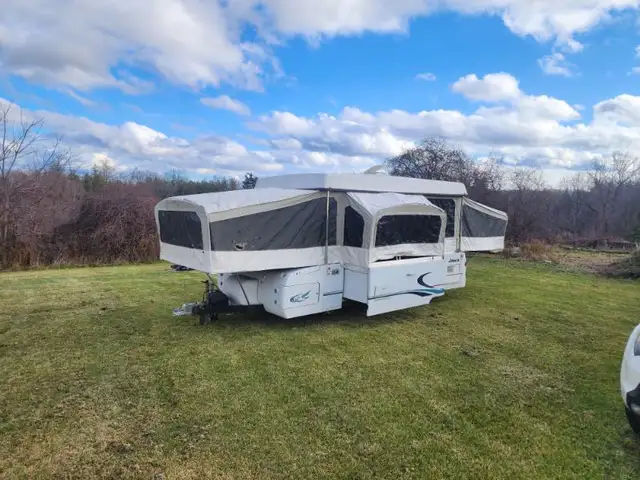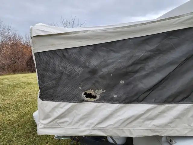 Jayco tent trailer. Long trailer for tent style, rare tip out. Surge brakes. Hot water heater land furnace. Canvas is one year old 2024, minor mice damage to canvas.