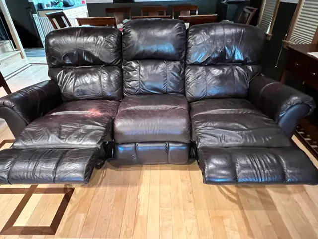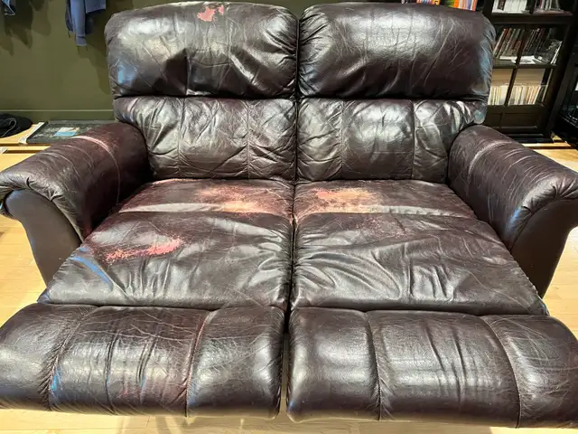 To give away in NW Calgary - you provide your own truck. La-Z-Boy leather, recliner, couch and love seat in fair condition. 12 years old, leather is faded in a couple of spots. One reclining handle on the couch is broken. La-Z-Boy service should be able to provide a replacement. Excellent for a basement, but can be used in a living room too.