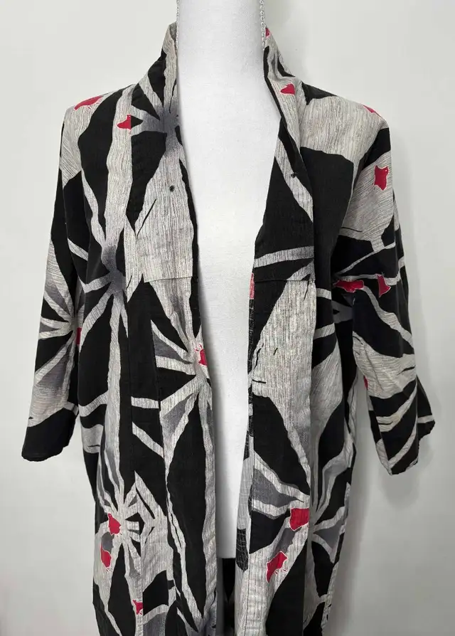 •Features a striking, modern black, white and gray geometric design, sometimes described as a bamboo lattice pattern, with red bird accents