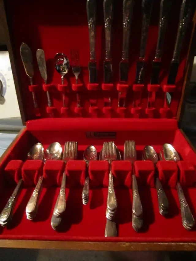 6 dinner knives, 6 dinner forks, 6 salad forks, 6 dessert forks, 6 table spoons, 6 tea spoons, 6 5 O'clock spoons, 6 cream soup spoons, 1 serving spoon, 1 sugar spoon, 1 butter spreader, 1 Master butter spreader