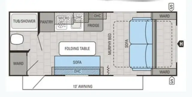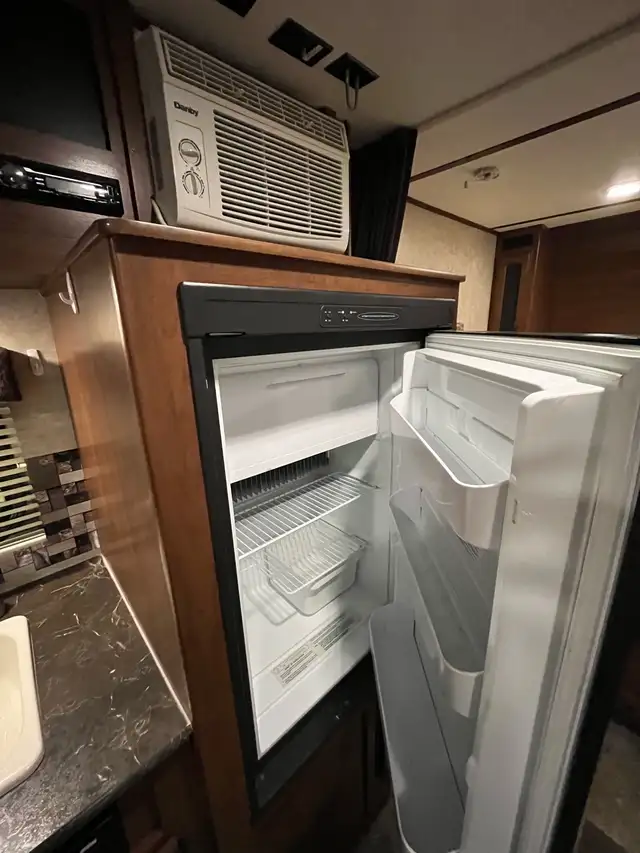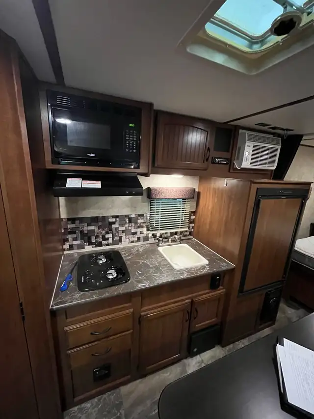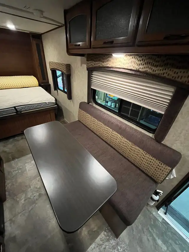 All the options here! Power awning w/LED strip lighting, LP quick connect option, water heater, furnace, microwave, 2 burner w/custom cover, ac, fridge w/mini freezer, radio/speakers, fiberglass exterior and plenty of storage. Front queen bed easily converts to a sofa if not needed. Large bench style dining table with mobile table.