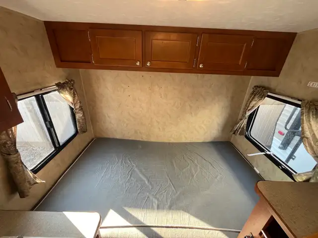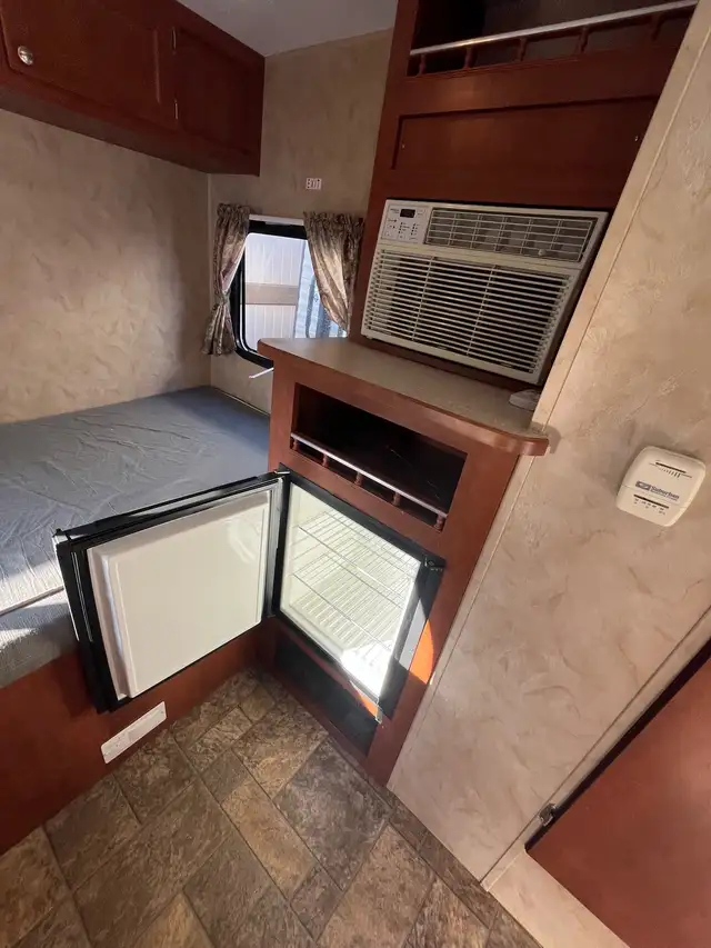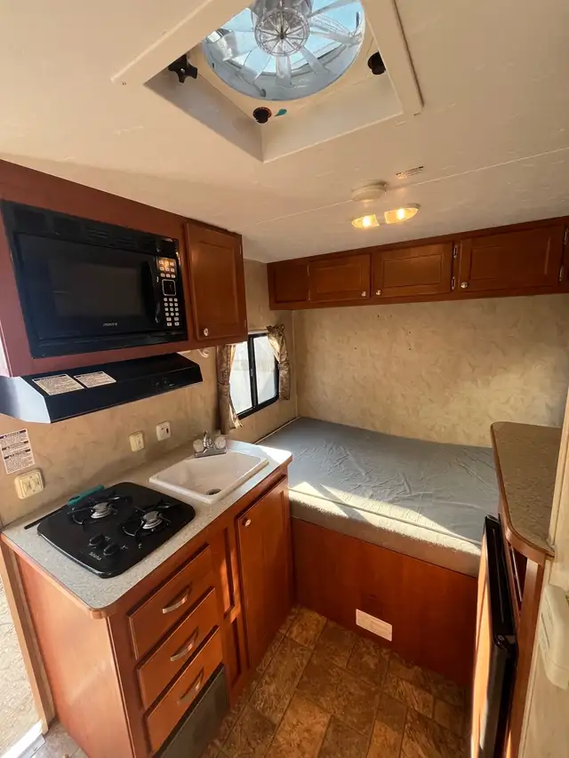 Other amenities include a kitchenette with a refrigerator, AC, stovetop, sink, large under bed under dining bench storage.