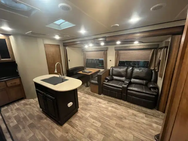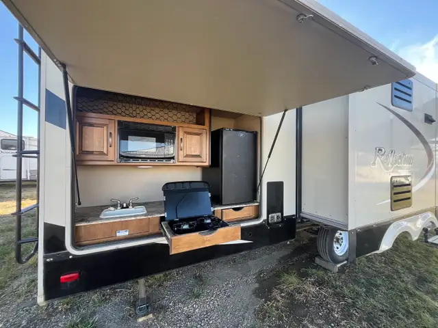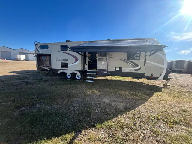 The 2016 Grand Design Reflection 308BHTS is a triple-slide travel trailer designed for family camping, featuring a private rear bunkhouse, a large outdoor kitchen, and spacious living areas. The four-season unit includes an enclosed and heated underbelly, along with a 50-amp electrical service. So much to offer throughout, pantry, island w/ huge stainless sink, private bunk room private master bedroom w/walk around bed, large corner shower, recliners, outdoor kitchen, fireplace and more this unit is a absolute must see!!