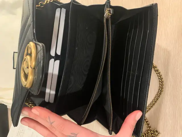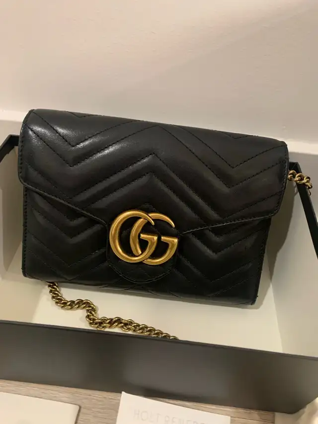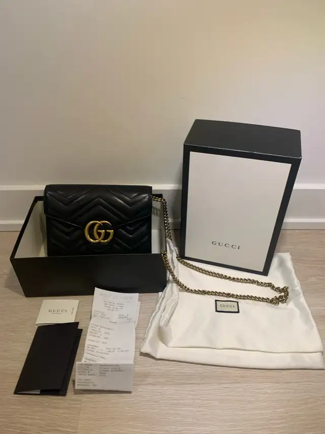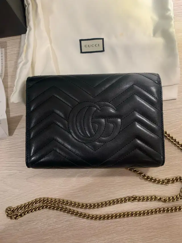 Hello, I'm selling a good conditioned authentic Gucci Marmont wallet on chain. Minor scratches but looks new. It comes with the box, receipt, and dust bag.