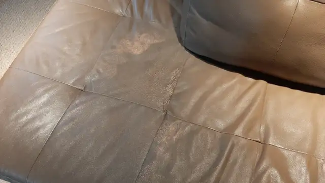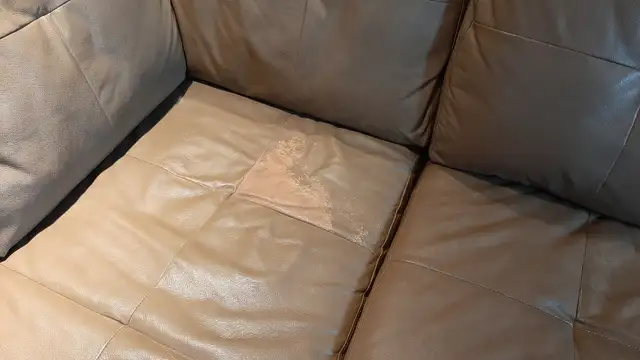 Smaller sectional piece has some blemishes where the leather dye has faded (see photos), easily camouflagued by throws and pillows (see photo).
