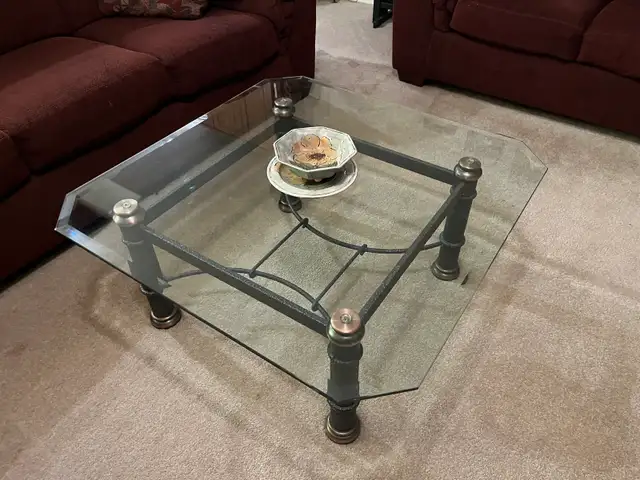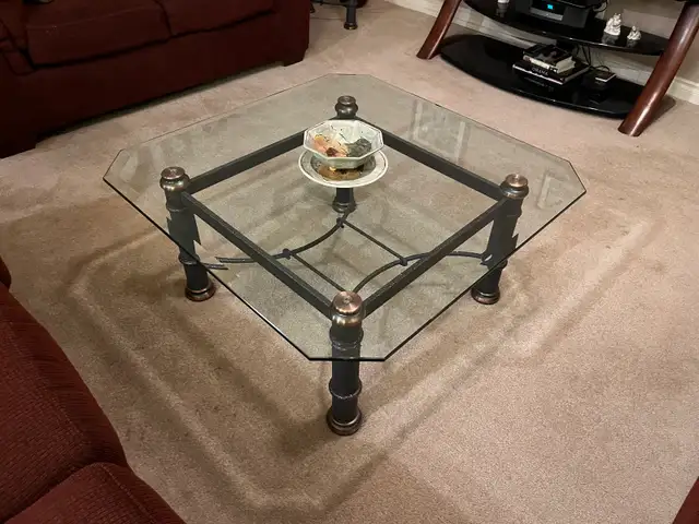 Thick glass with wrought iron base. Excellent condition.