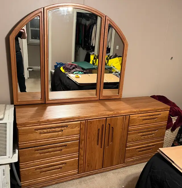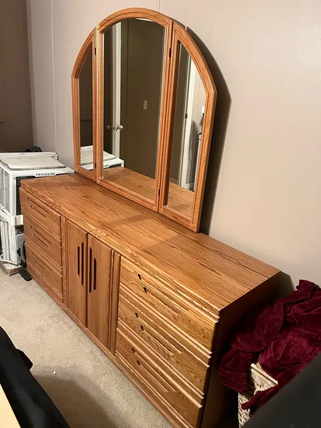 Oak dresser with folding mirror. Six drawers middle storage. Excellent condition.