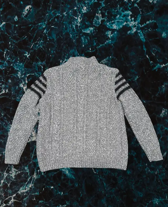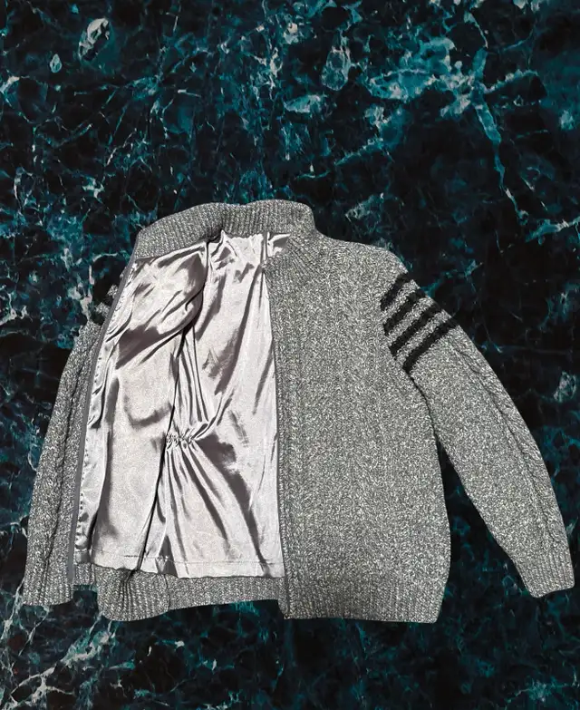 For sale: 1of 1 as in 1 of a kind mens grey knitted zip up cardigan.