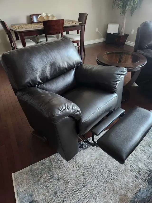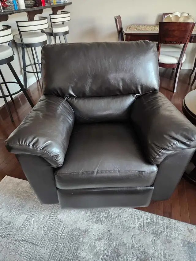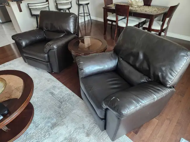 Dark Brown faux leather. Very comfy. First chair is PERFECT condition. Second chair has a bit of wear starting on the arms. Take both for only $250. Call or msg (780) 994-1057 anytime.