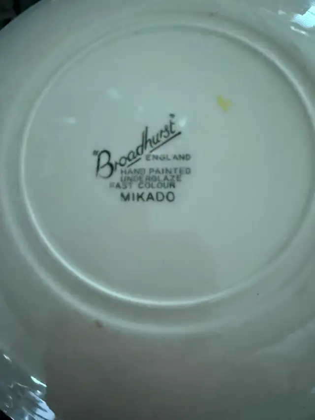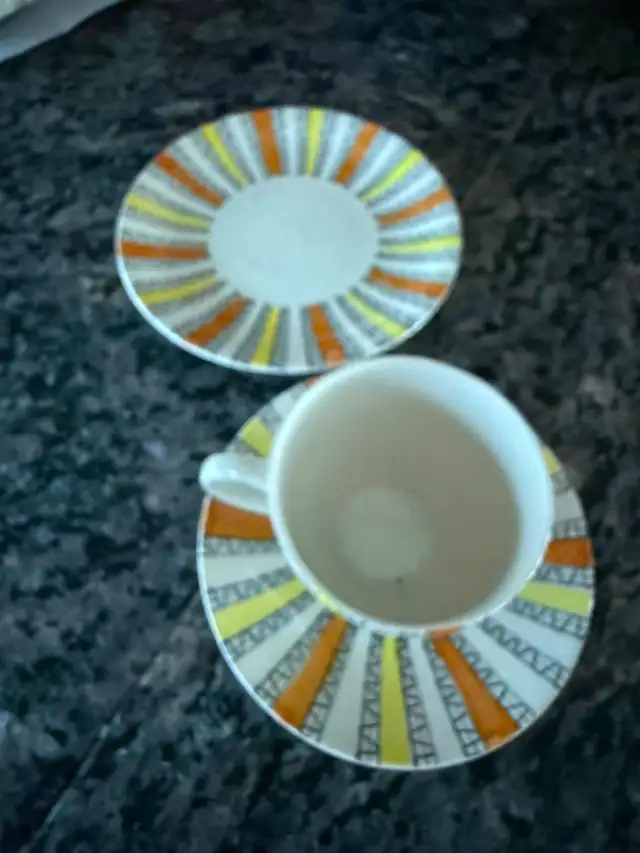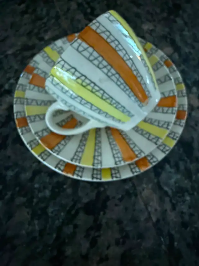 Broadhurst 3 piece tea set. Cup, saucer and small plate. Mikado. Hand painted. Orange and yellow. Pattern from 1963. Asking $20. Call or text 204-430-4131