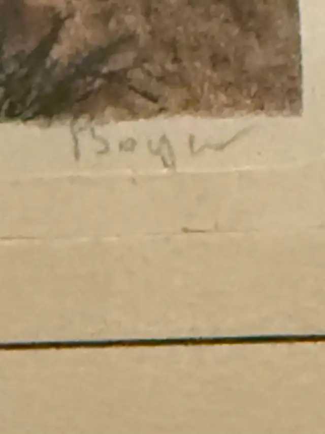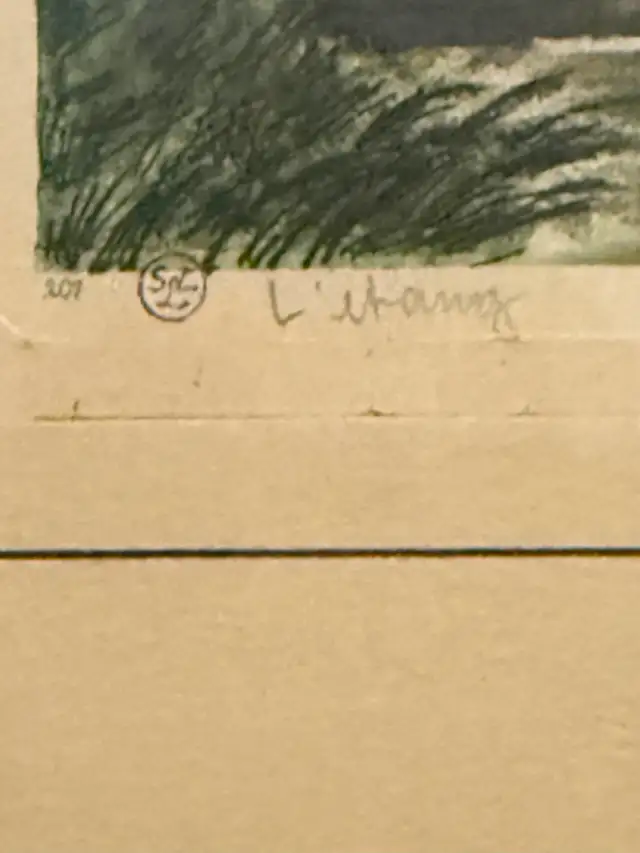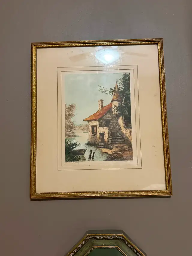 Vintage Genuine Etching by Boyer entitled “the Pond”. 1936. Paris Etching Society. Size 15”x15”. Gold painted wood frame. Asking $99.00. Call or text 204-430-4131