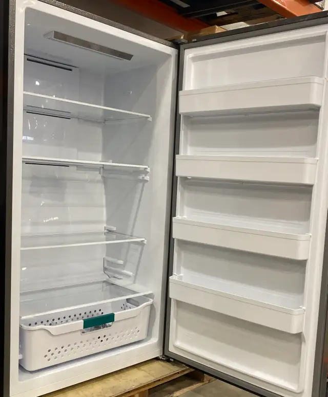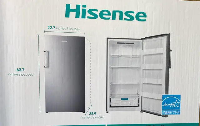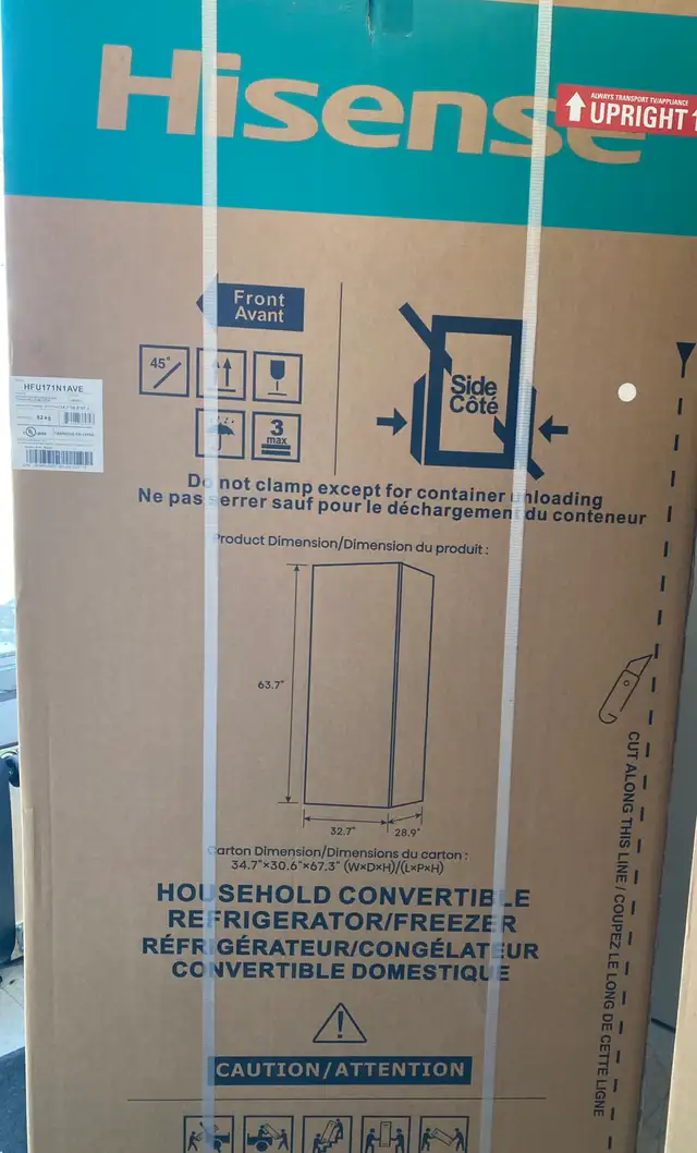 Large Hisense 17 ft.³ convertible, upright freezer, with measurements of 33” wide, 31” deep by 64” high. It's garage ready, has a reversible door swing, and is frost free. It comes with a two year factory warranty. New in factory crate. $875. 204.661.4750.