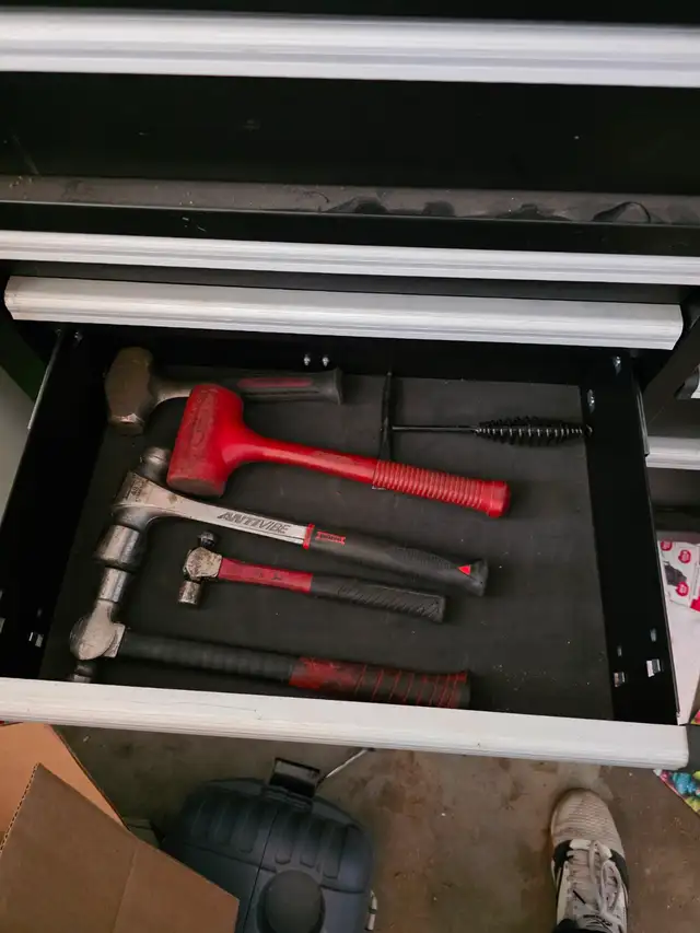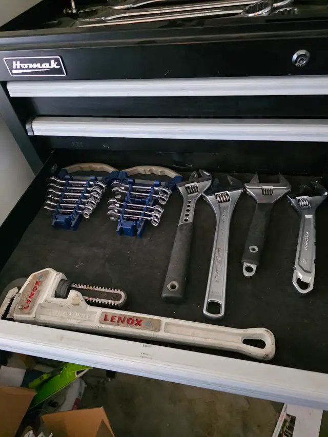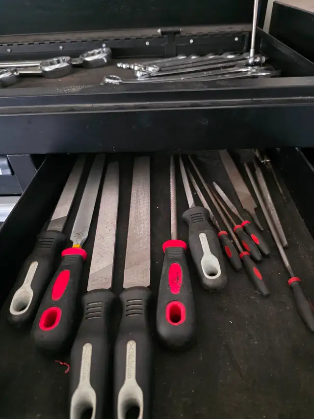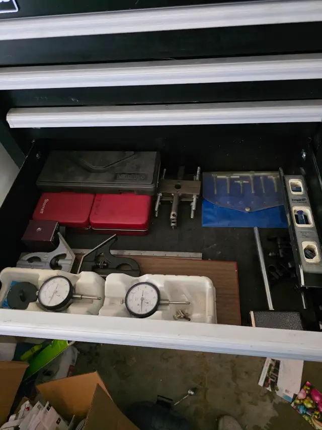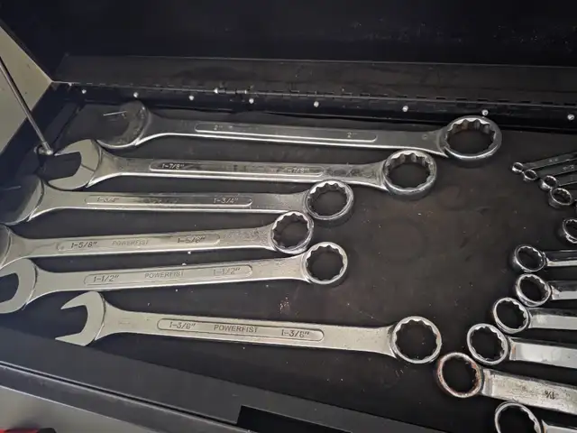 I have many measuring tools (caliper, dials and micrometers), electric and cordless tools, sockets, wrenches(1/4" to 2"), ratcheting and stubby wrenches, pliers etc. Jackstands, pry bars, taps and tap handles, various files and hammers, punches and chisels.