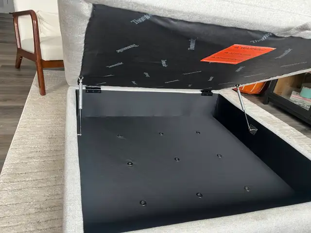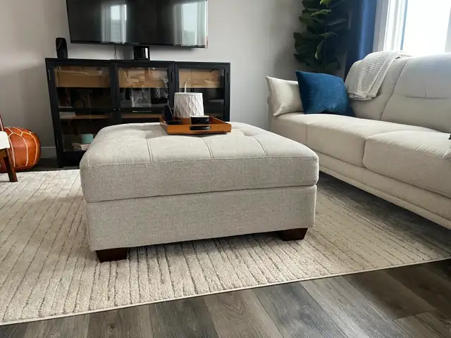 Thomasville Fabric Storage Ottoman - cream in color. Like new condition. Zero wrong with it. Size is 34.2 x 34.2 x 19.2 in. Asking $300. Contact Shelley by text or phone 306-292-2556 for pick up.