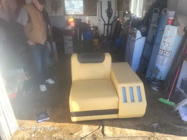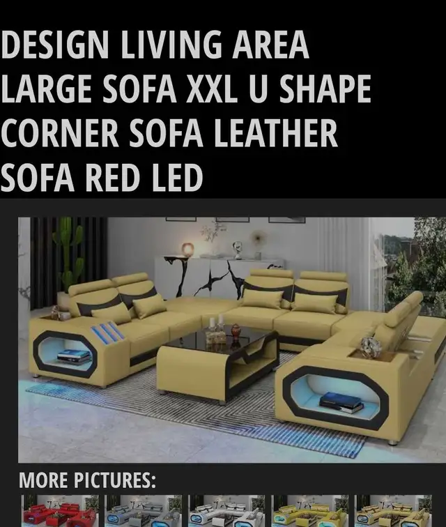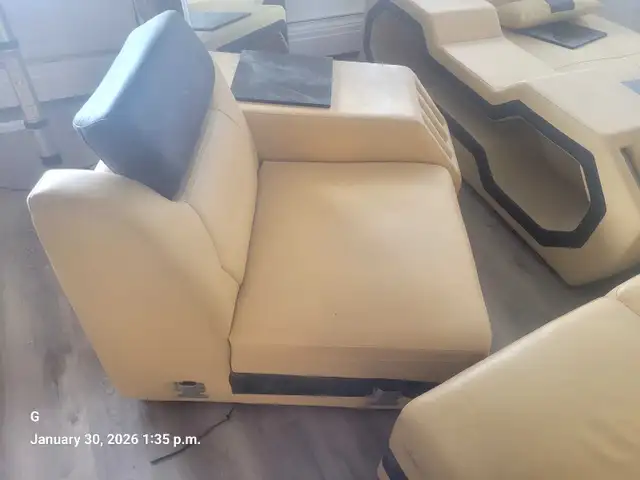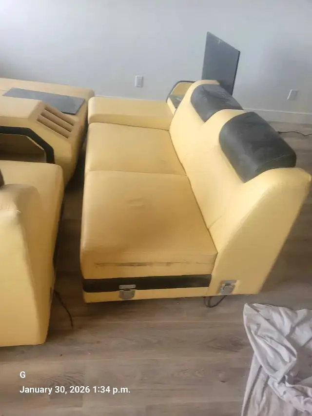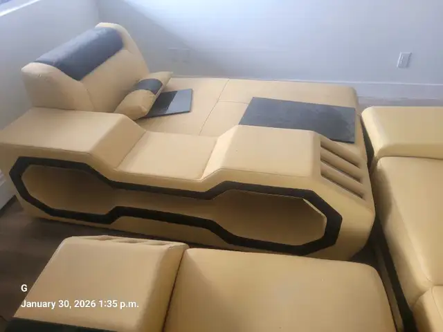 First picture is what this item should look like when set up, Never got a chance to actually take proper pictures of the furniture set up in penthouse Suite. Right now the furniture is disassembled and is stored in my garage. Delivery available for a fee has lighting and Bluetooth speakers built-in and coffee table leather bound with 1/2 smoked tampered glass not shown in actual physical item Northside to view 587-937-1548