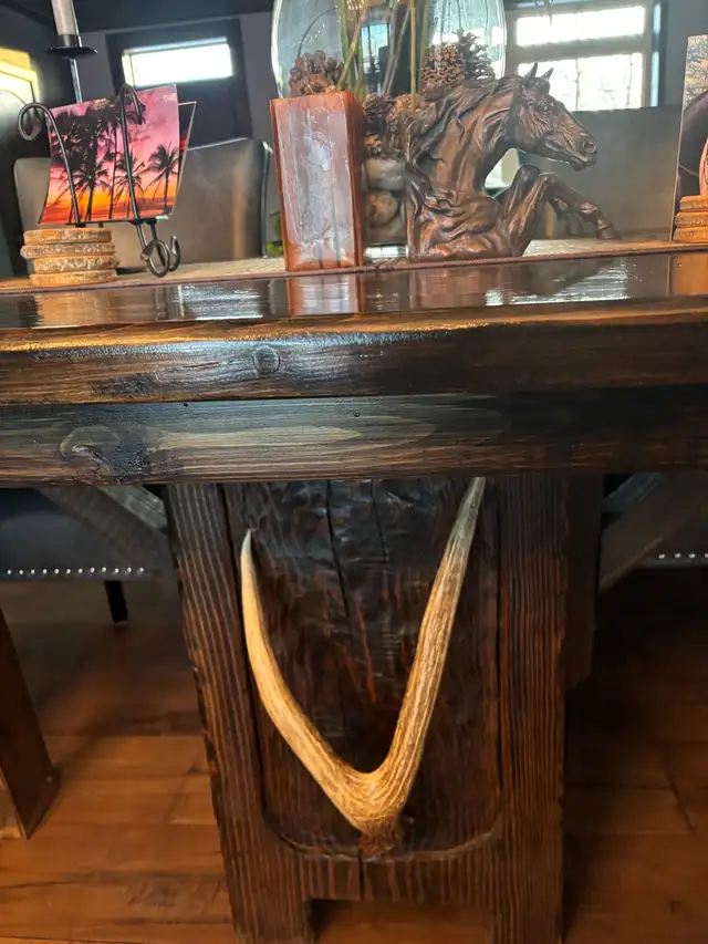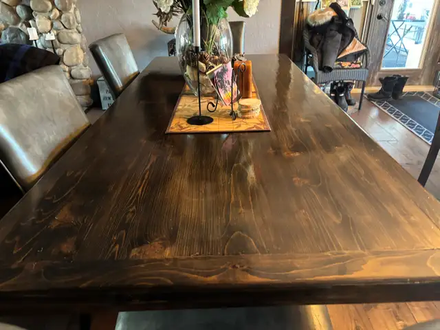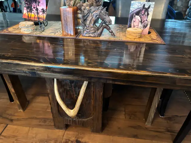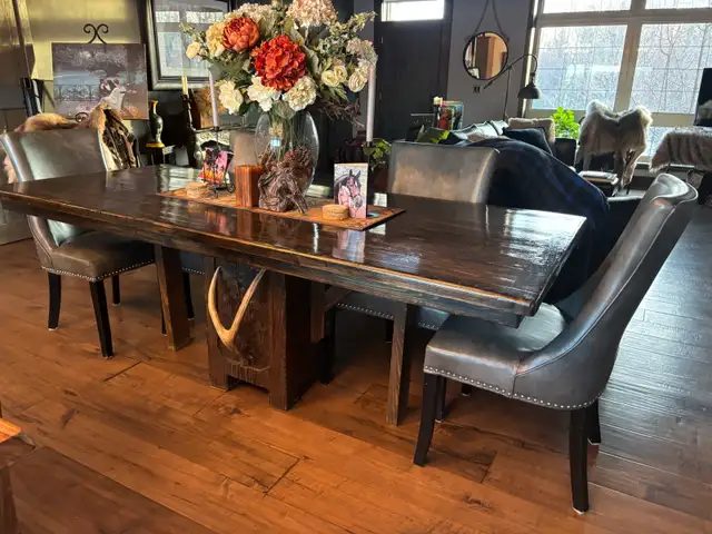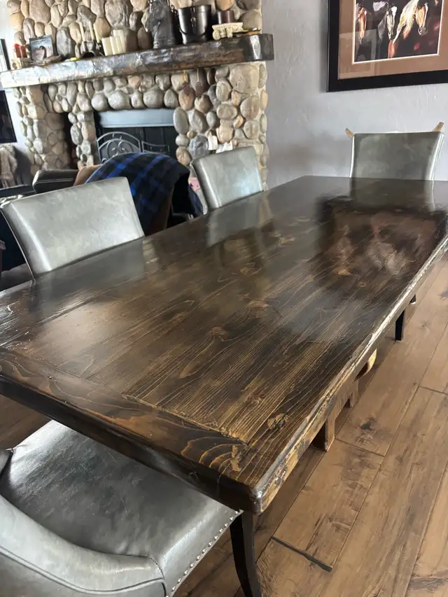 Beautiful custom made, solid wood dining table with 4 high back chairs. Measures 7'3” x 3'2”.