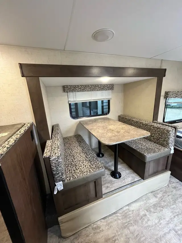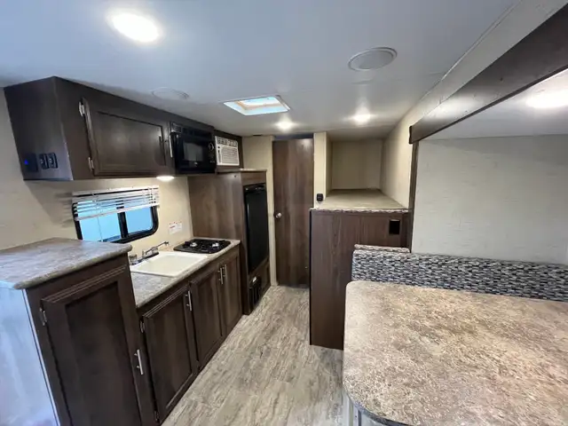 This 18ft KZ Classic is an ultra-lightweight travel trailer with a large dining slide-out, featuring a bunkhouse design suitable for small to medium-sized families. Its compact size makes it easy to tow, while the layout provides several sleeping options. Loaded with all your options A/C, water heater, microwave, 2 burner stove, furnace, bluetooth w/indoor & outdoor speakers, power awning w/ led light strip & more! Rear bunks & front double bed. Dining table make into a roomy bed if needed. A great compact family unit!