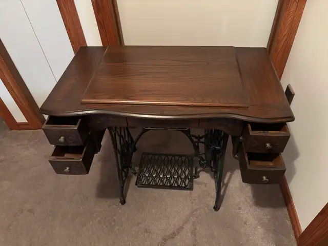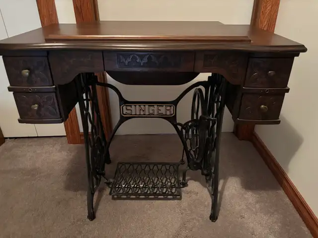 ESTATE SALE - ANTIQUE SINGER SEWING MACHINE CABINET IN EXCELLENT CONDITION ASKING $150.00 OBO. IF AD IS UP THEY ARE STILL AVAILABLE . PLEASE CALL OR TEXT LEO @ (403) 660-4046