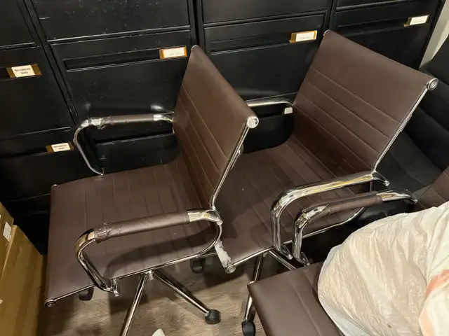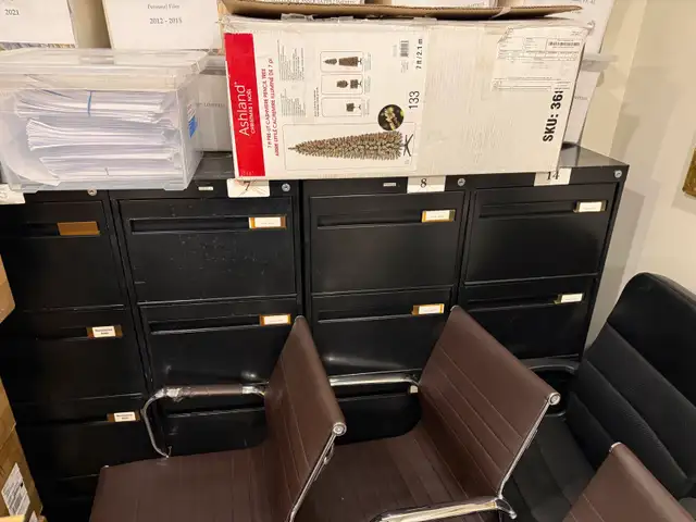 Approximately 6 filing cabinets and 5 office chairs.