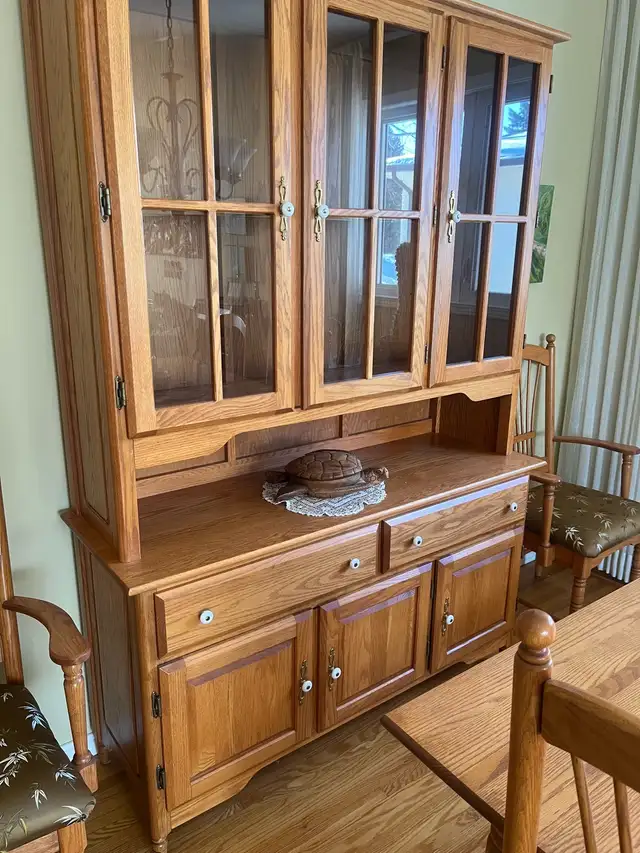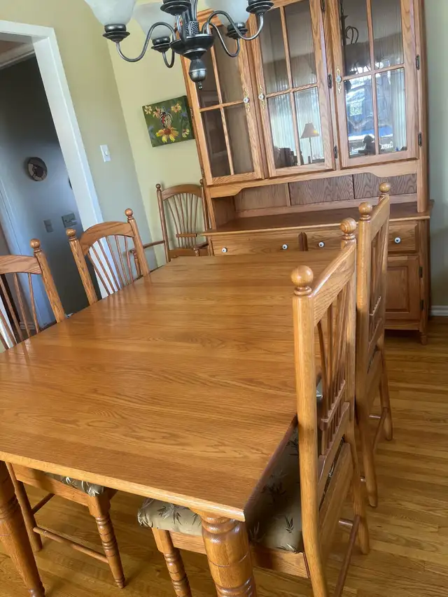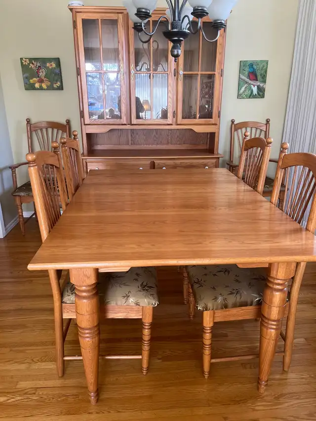 This solid Oak dining table is in excellent condition. It measures 59.5 x 41.5” (includes two 12” leaves).