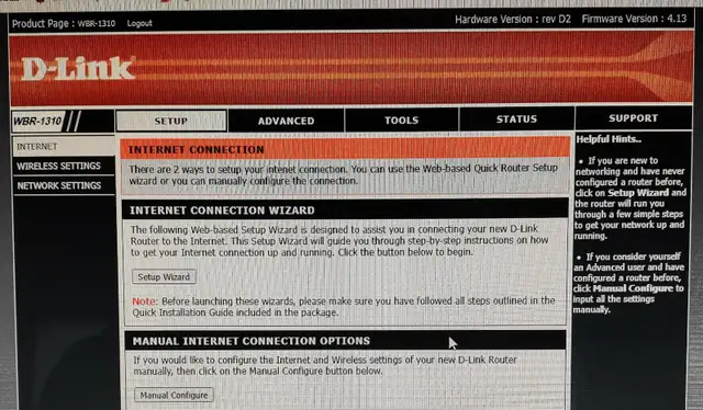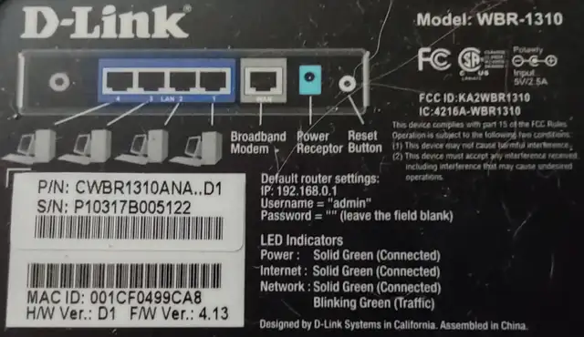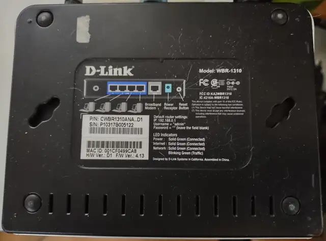 "The D-Link WBR-1310 is an older 802.11g Wireless G router designed for basic home networking, offering speeds up to 54 Mbps. It features four 10/100 LAN ports for wired connections, an SPI firewall for security, and a detachable antenna. It is best suited for light internet browsing, with a compact design suitable for small apartments."
