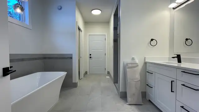 This stunning home boasts an impressive main level exceeding 2000 sq ft, featuring 9ft ceilings, expansive transom windows, and a luxurious open-concept kitchen and dining area with a butler pantry and prep sink. Enjoy the private 280 sq ft covered rear deck, perfect for outdoor entertaining, with direct access to the master ensuite bathroom. Ensuite bath includes a relaxing soaker tub, large Roman shower, and a water closet.