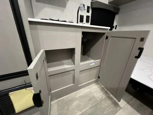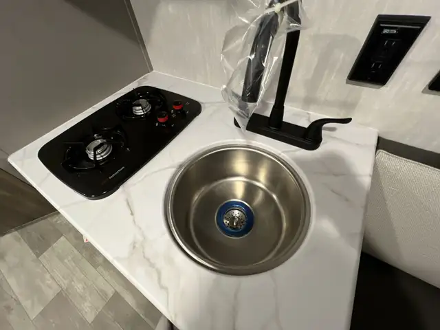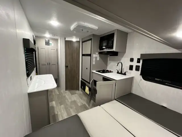 • Fully equipped galley with two-burner cooktop, microwave, and ample storage