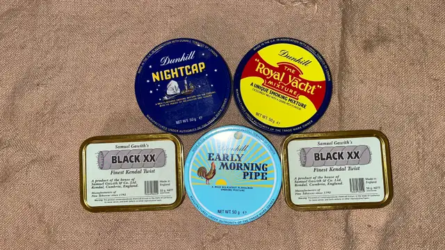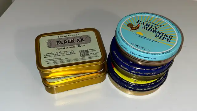 • 5 Collector Tobacco Tins: Exceptionally clean, bright tins from Dunhill (Early Morning Pipe, Nightcap, Royal Yacht) and Samuel Gawith.