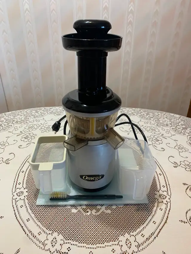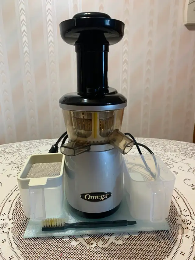 Two-Stage Juicer System. Juice fruits, vegetables, wheatgrass and greens. Crushes food, then presses food for maximum yield.