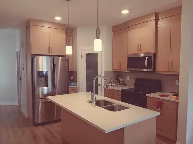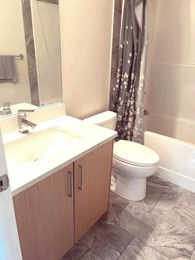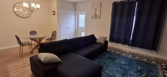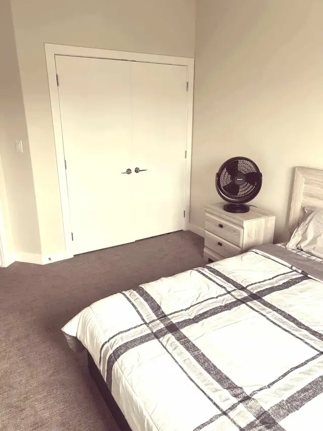 1 Furnished room with separate bathroom for rent in a new 3 bedroom house. New neighborhood, close to the river (5 minute drive), close to shopping Centre, and park. Pet friendly home 1 friendly dog in the house. Nice size room has a big closet, queen size bed with new mattress, new side desk with a mirror top , and a new head board with a mirror, separate bathroom. Shared laundry(on the top floor next to the bedrooms), kitchen and living room. 65 inch tv in the living room, and high speed internet. There is a deck and fenced back yard for the summer as well. Kitchen has pots, pans, plates, cups, cutlery items. Available if the ad is up. Please message me with your name and details and any questions. $750 per month with all utilities, and $300 damage deposit, looking for short term or long term. Please contact me at 403-401-0371.
