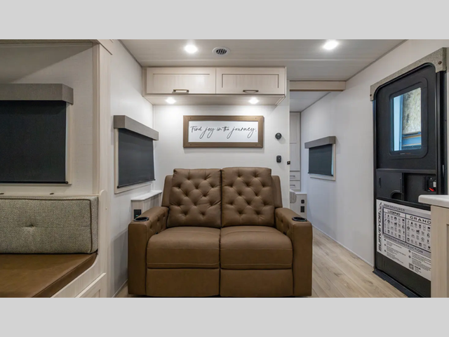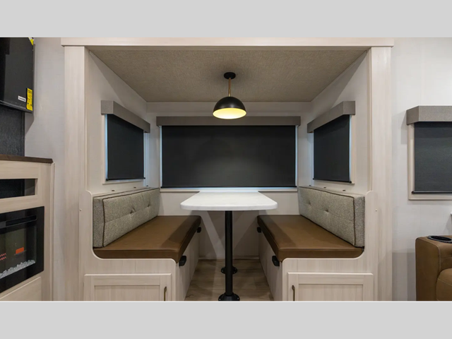 Whether you're camping with friends or family, you'll love the space and comfort found in this travel trailer. The outside kitchen is packed with features, such as a gas griddle, sink, refrigerator, and a shelf, plus there is a 21' electric awning for shade. Head inside to relax on the EZ- out sofa, or play a game at the booth dinette. You will also love the HD TV for your favorite shows at night. This model includes a full rear bath with a linen closet for clean towels and an upgraded slow-close shower door.