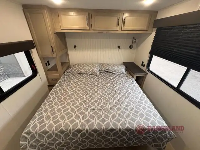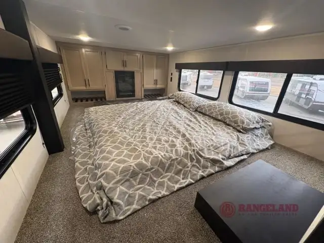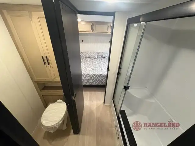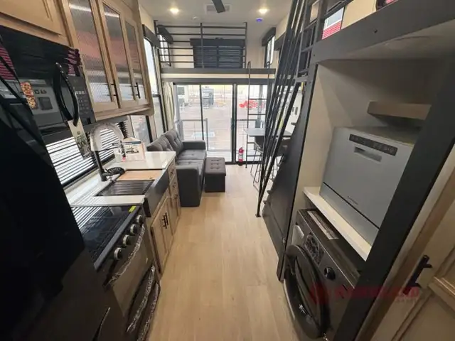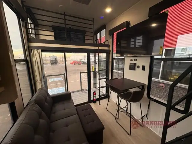 This model is similar to 16ML but larger! A bigger bathroom, RV king bed in the lower master, and a queen bed plus a twin bunk mat in the front loft. And the second loft can be utilized as extra sleeping space or storage space! There is an 18 cu. ft. refrigerator so you can stock up for a week long vacation, a hide-a-bed sofa that can transform into added sleeping for guests, and a high top table with two stools to dine at. The bathroom below is split with a shower on one side, and a private toilet area and sink opposite. And the view is amazing from just about anywhere inside.