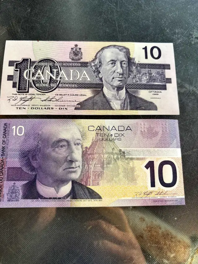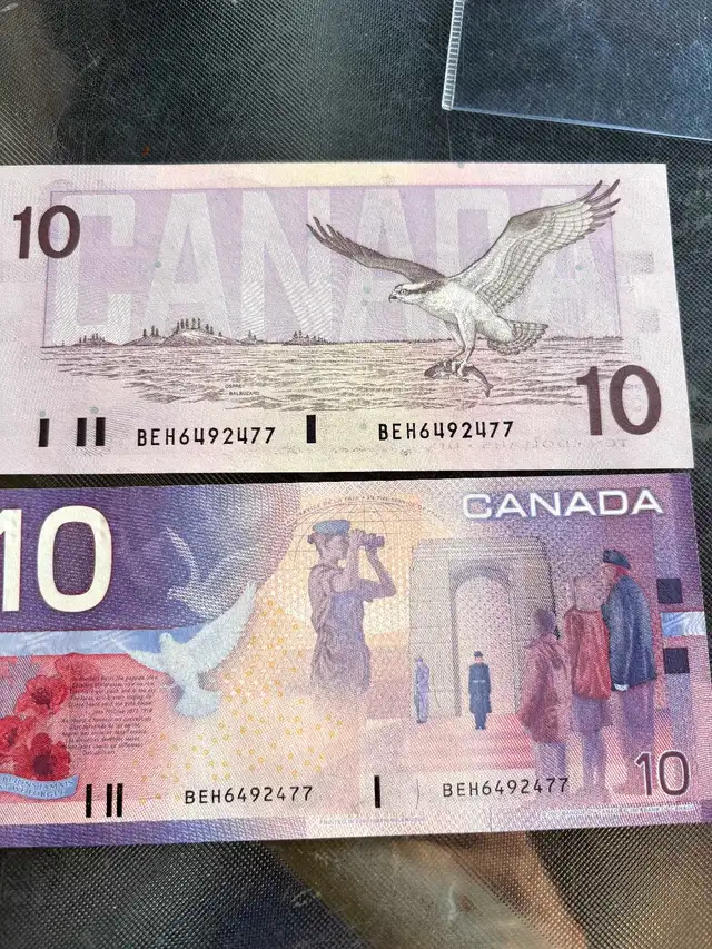 We have 2 $10 banknotes , one from 1989, one from 2001 with identical serial numbers in very fine condition in plastic folders. The pair was put together by the mint as a special collectors issue, they are real !!! Much better chance of winning the lottery than ever finding something like this by chance!! Asking $200 or best offer and I can arrange delivery to the Edmonton area on one of my trips to the city to pick up materials for my flooring business. Message me here or call or text 780-264-3106 or email richardbrett@live.com