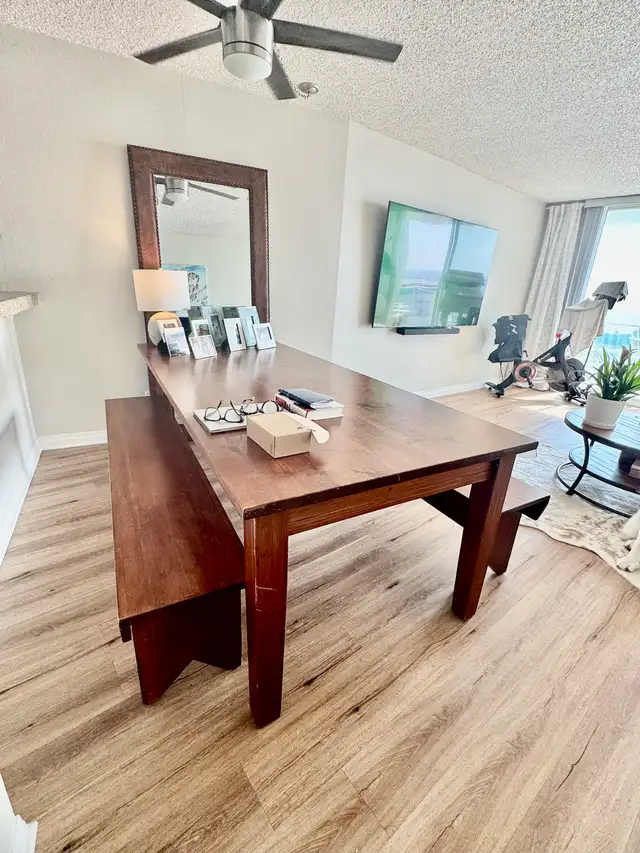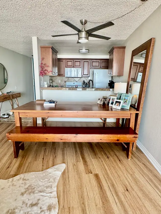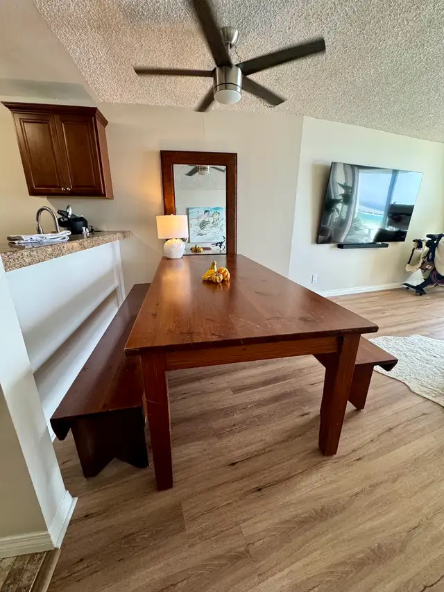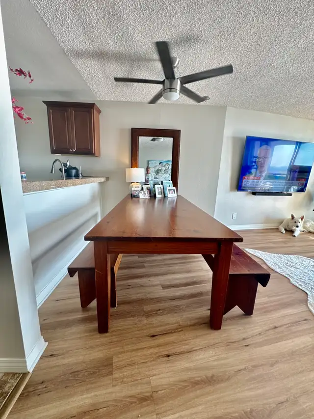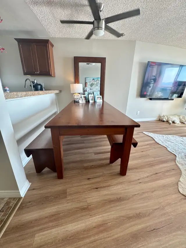 An absolute beautiful piece. Legs come off to make for easy transportation. Solid wood. Benches can easily be pushed underneath the table for easy access when not using. Can see 10 people. Ready for pick up. (403) 710-6106 SW Somerset.