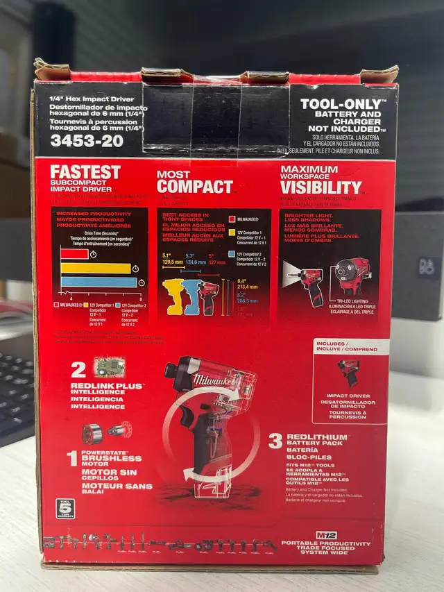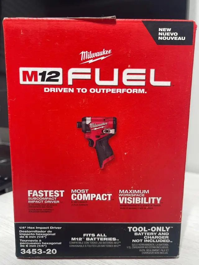 The MILWAUKEE M12 FUEL 1/4in Hex Impact Driver is the Fastest Subcompact Impact Driver, the Most Compact, and provides Maximum Workspace Visibility. The POWERSTATE Brushless motor delivers the fastest driving speeds in the subcompact class for unmatched productivity. At only 5in long and 7.6in tall (with M12 CP 2.0 Ah battery), this solution is the most overall compact impact driver in class, allowing greater access in tight spaces and overall portability. Tri-LEDs surround the bit accessory with brighter lights and less shadows providing maximum workspace visibility. MILWAUKEE REDLINK PLUS Intelligence delivers top of the line thermal performance allowing more work to be completed. Get all day runtime when paired with the MILWAUKEE M12 REDLITHIUM battery pack. The M12 FUEL Impact Driver is part of MILWAUKEE M12 System which is fully compatible with over 125 solutions.