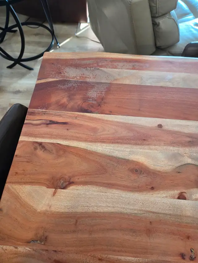 There is some varnish peeling in one corner. We purchased it this way and planed to touch it up but never got around to it.