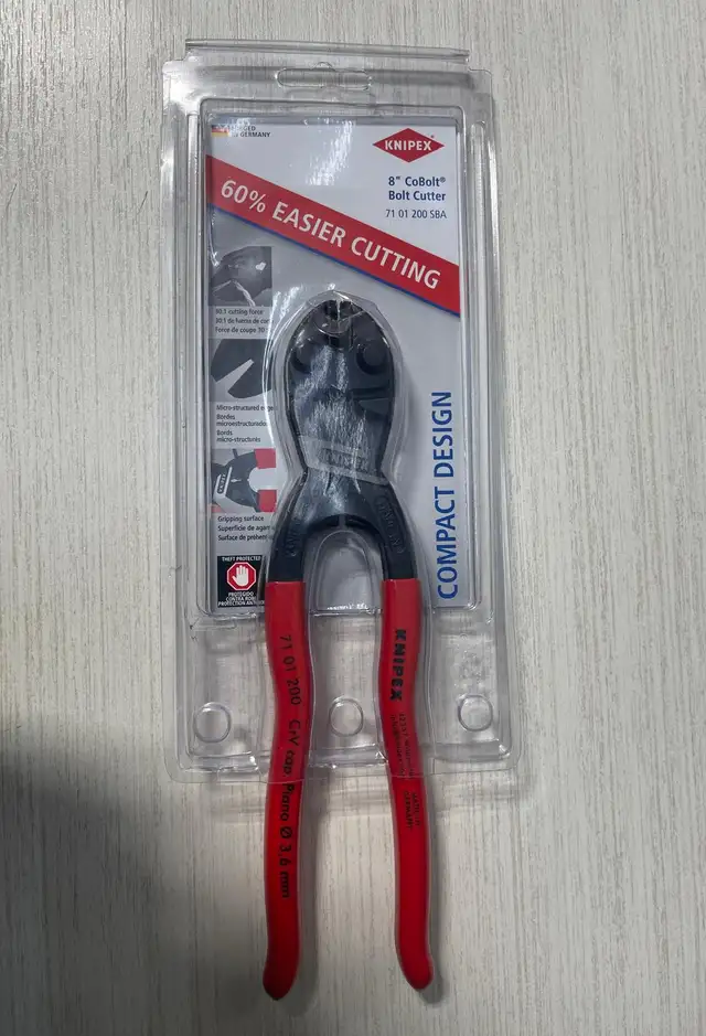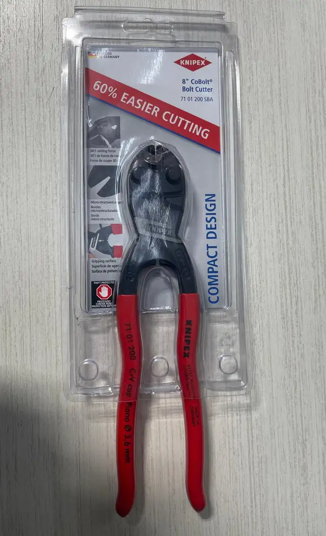 An all-around tool for the toughest demands, this Knipex high-leverage CoBolt cutter features a lever action design that applies 20 times more hand force for superior cutting power with less effort. This mini bolt cutter can cut through more than you ever thought possible up to 1/4-inch diameter with ease. It's ideal for automotive or construction applications, cutting cotter pins and nails, repeated use in factory assembly lines, cutting wire fencing in agricultural settings, or even everyday tasks such as cutting floral wire or fish hooks. Forged from chrome vanadium electric steel, these cutters are built to last. This lightweight cutter features precision-matched cutting edges for cutting soft or hard steel. It also features gripping jaws below the joint for gripping and pulling nails and wires.