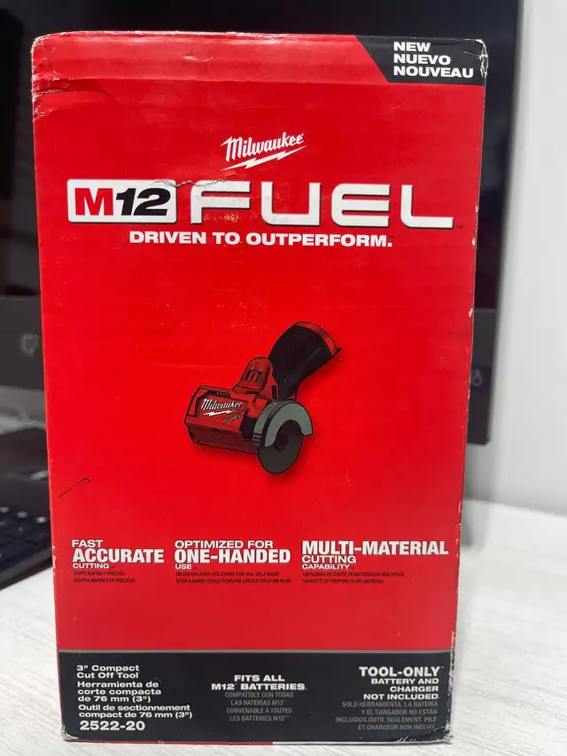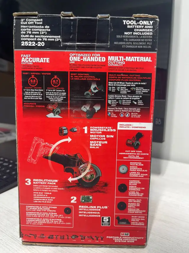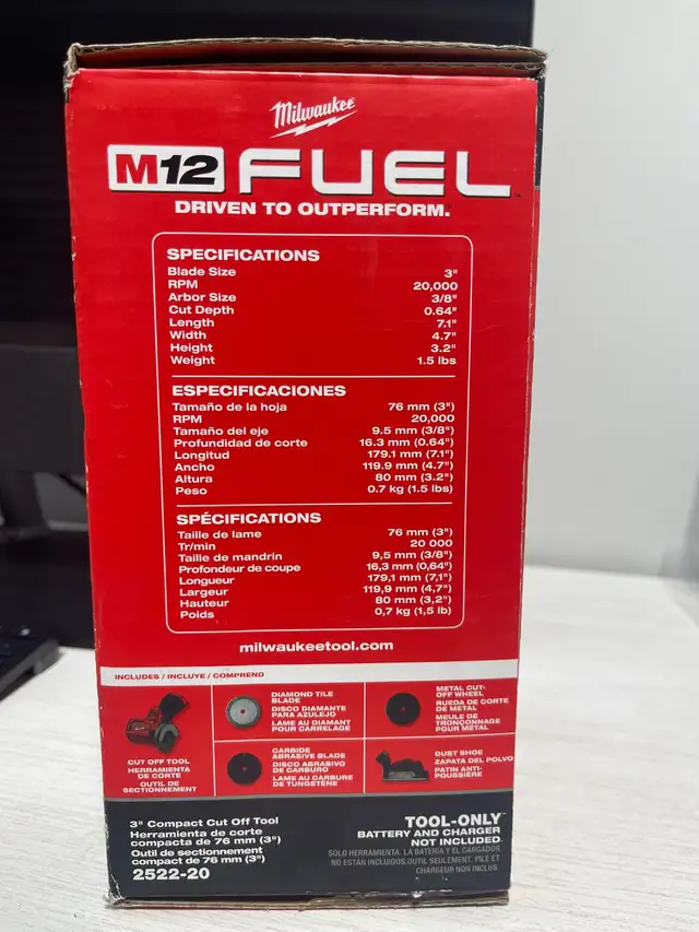 The M12 FUEL 3 -inch Compact Cut Off Tool delivers multi-material cutting capability in an ergonomic package, optimized for 1-handed use. Spinning at 20,000 RPM and featuring a POWERSTATE Brushless Motor, the 2522 delivers fast and accurate cutting performance in a wide range of materials. The unique reversible blade rotation feature provides users ultimate control over material removal, along with the ability to select their desired blade rotation for the direction they need to cut. For ultimate cutting versatility, the 2522 ships with 3 accessories: a metal cut off wheel, a diamond tile blade and a carbide abrasive blade. The M12 FUEL 3-inch Compact Cut Off Tool also includes a tool free accessory guard and shoe that includes a vacuum adapter for dust mitigation as well as cut depth adjustment.