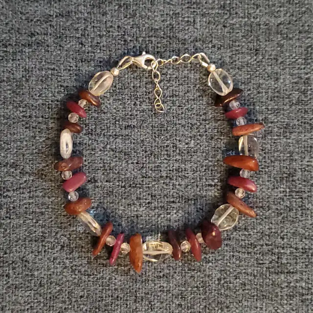 Red ruby with clear topaz in between, on sterling silver. 7-8 Inches long with extender