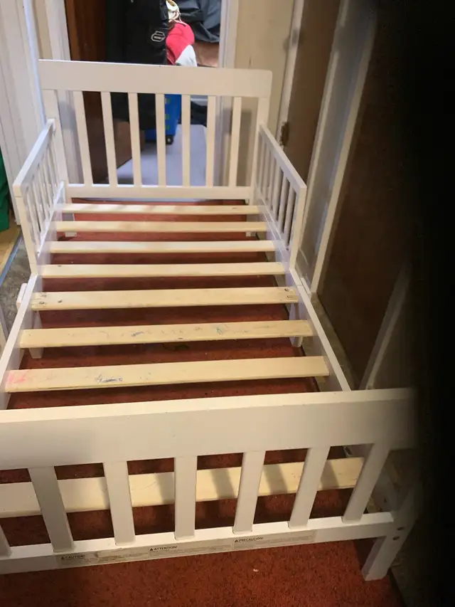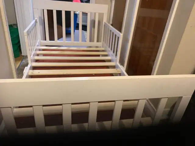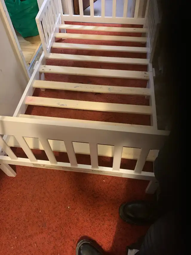 This white toddler bed is perfect for transitioning your little one from a crib, which is also available in matching design for the same price It's in used condition but has plenty of life left. A cozy and safe sleep space awaits, ready for countless bedtime stories and sweet dreams. It is sturdy and reliable for your child's peaceful nights
