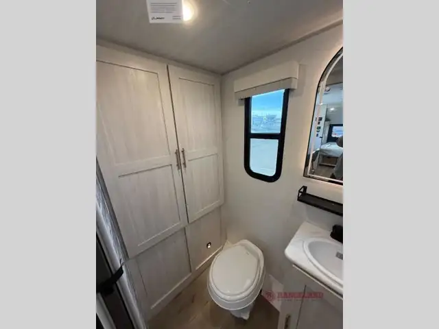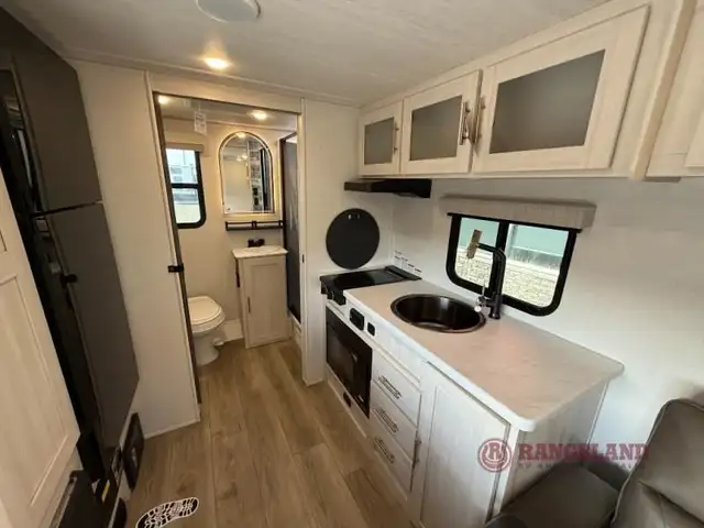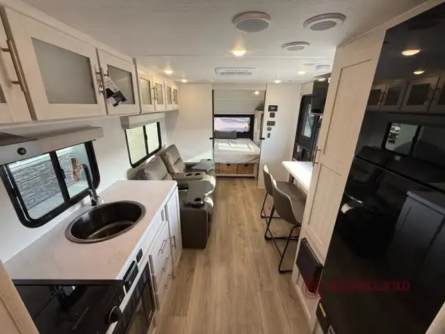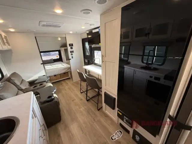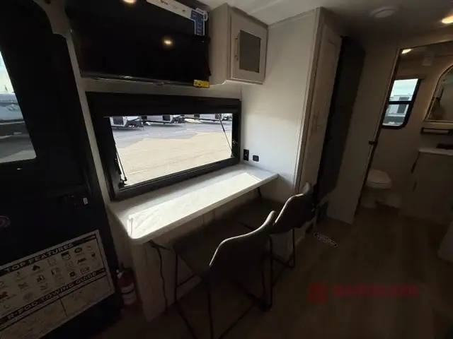 A front private bedroom with a walk-around queen bed, a full rear bath, and a theater seat are a few of the features that you are sure to want in your next RV! You can rest comfortably each night, plus all your clothing can be stored in the dual wardrobes to keep everything tidy. If you're needing more sleeping space, just choose the optional tri-fold sofa in place of the theater seat! The chef of your group can make meals on the two burner cooktop or in the air fryer/microwave, and there is a refrigerator for perishables. And the bar top with two seats and the flip-up window provide a great view outdoors as you dine together.