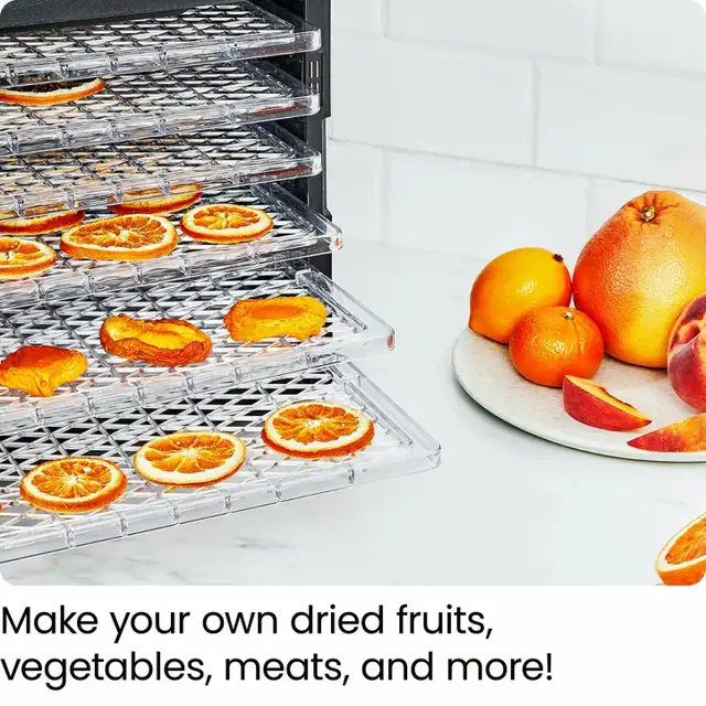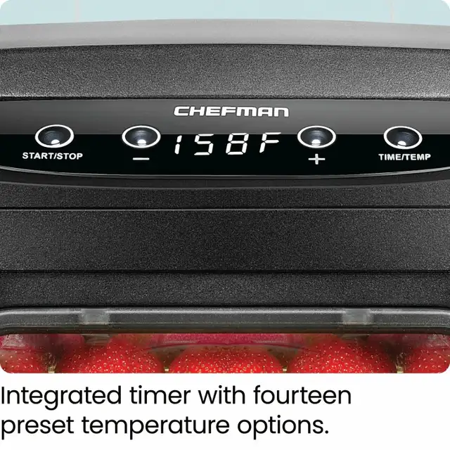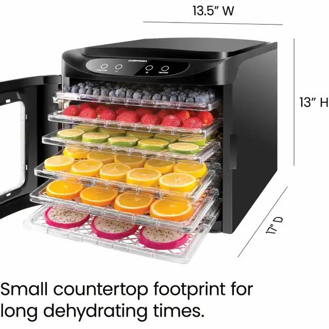 Preserve fruits, vegetables, meats, and herbs with ease using the Chefman 6-Tray Digital Food Dehydrator. Featuring adjustable temperature controls and spacious drying trays, it delivers consistent airflow for evenly dried results every time. Ideal for making healthy snacks, jerky, and dried foods at home with simple digital operation.