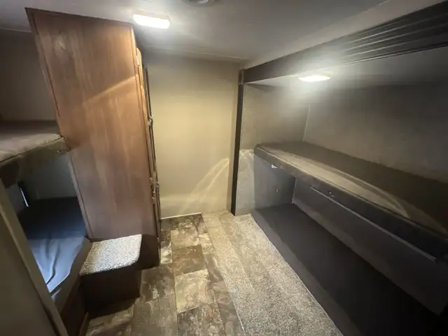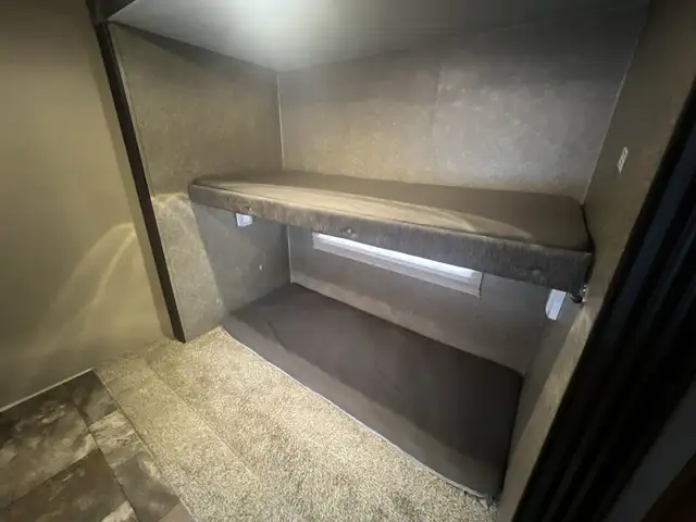 On the exterior you get an elegant look with storage, large awning, tongue, Stability jacks, and rack on the rear are among a few upgrades. On the inside you get a fridge, dinette and wide open concept with Couch for relaxing on and converts into an extra sleeping space. You get 4 bunks int he bunk house as well as more storage. In the bathroom there's a toilet, sink with vanity, shower and outside access. The master suite has a queen sized bed and storage.