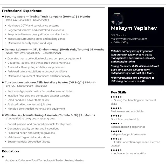 Please message me if you have a position: 416-824-0664